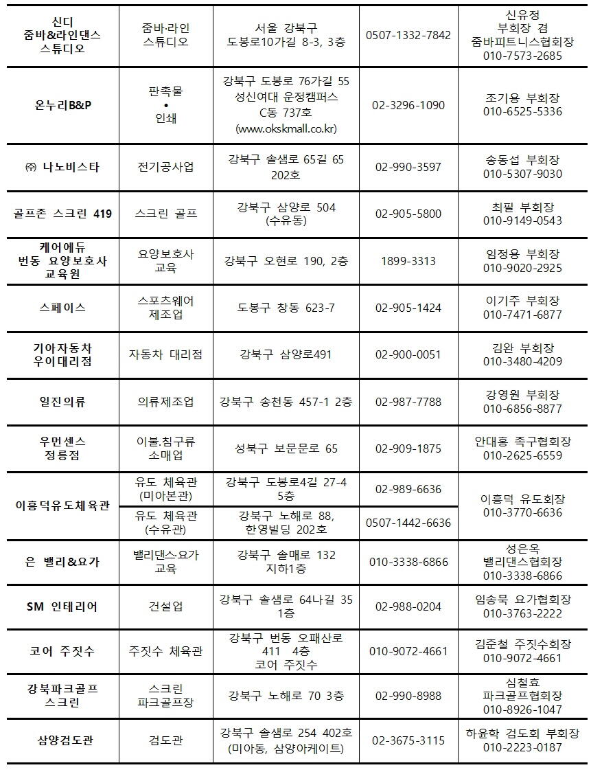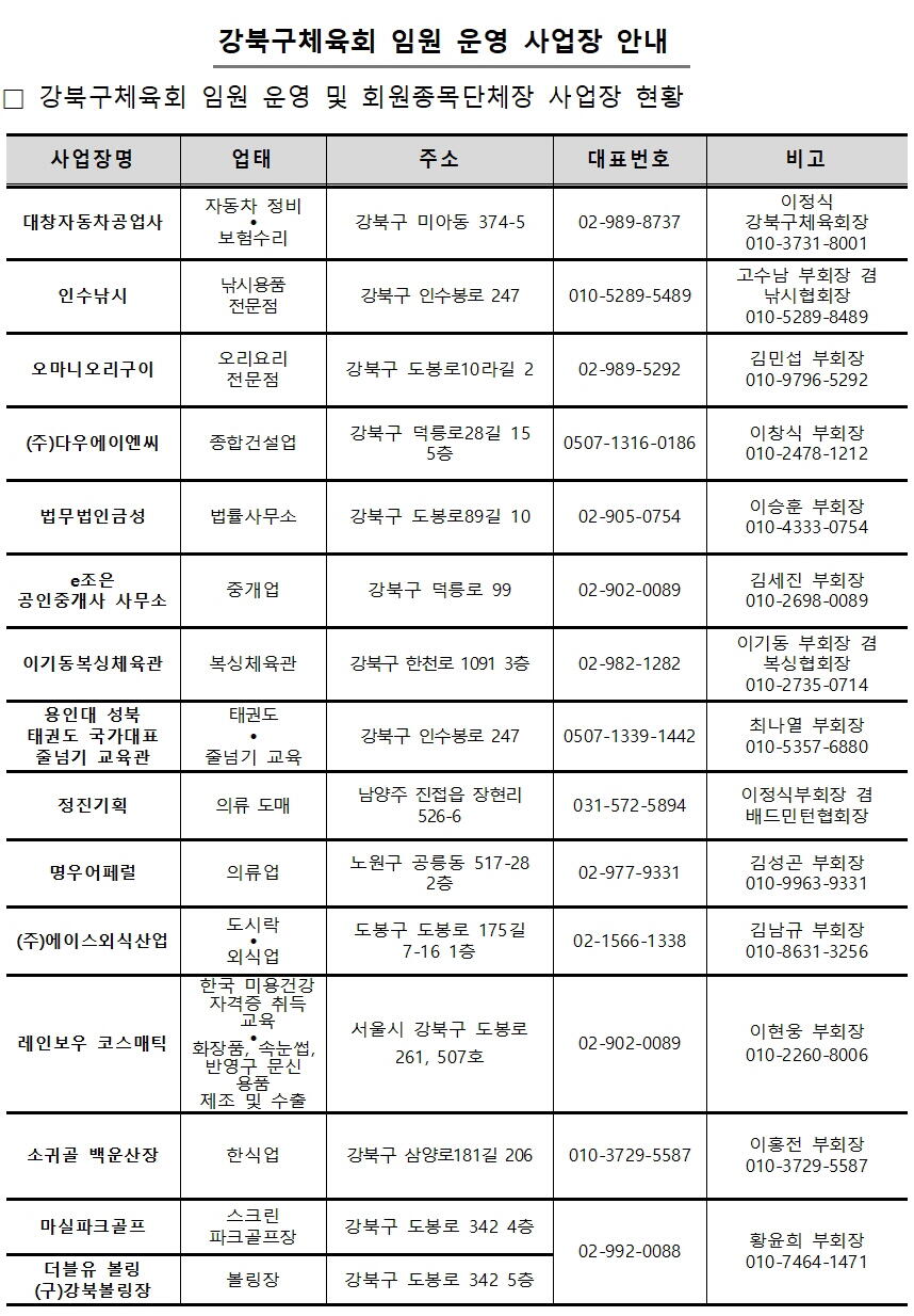 강북구체육회 임원 운영 사업장 안내