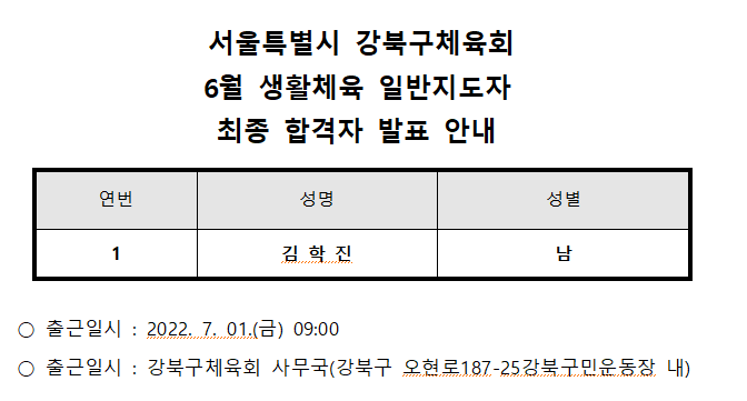 2022년 6월 생활체육지도자 최종 합격자 발표