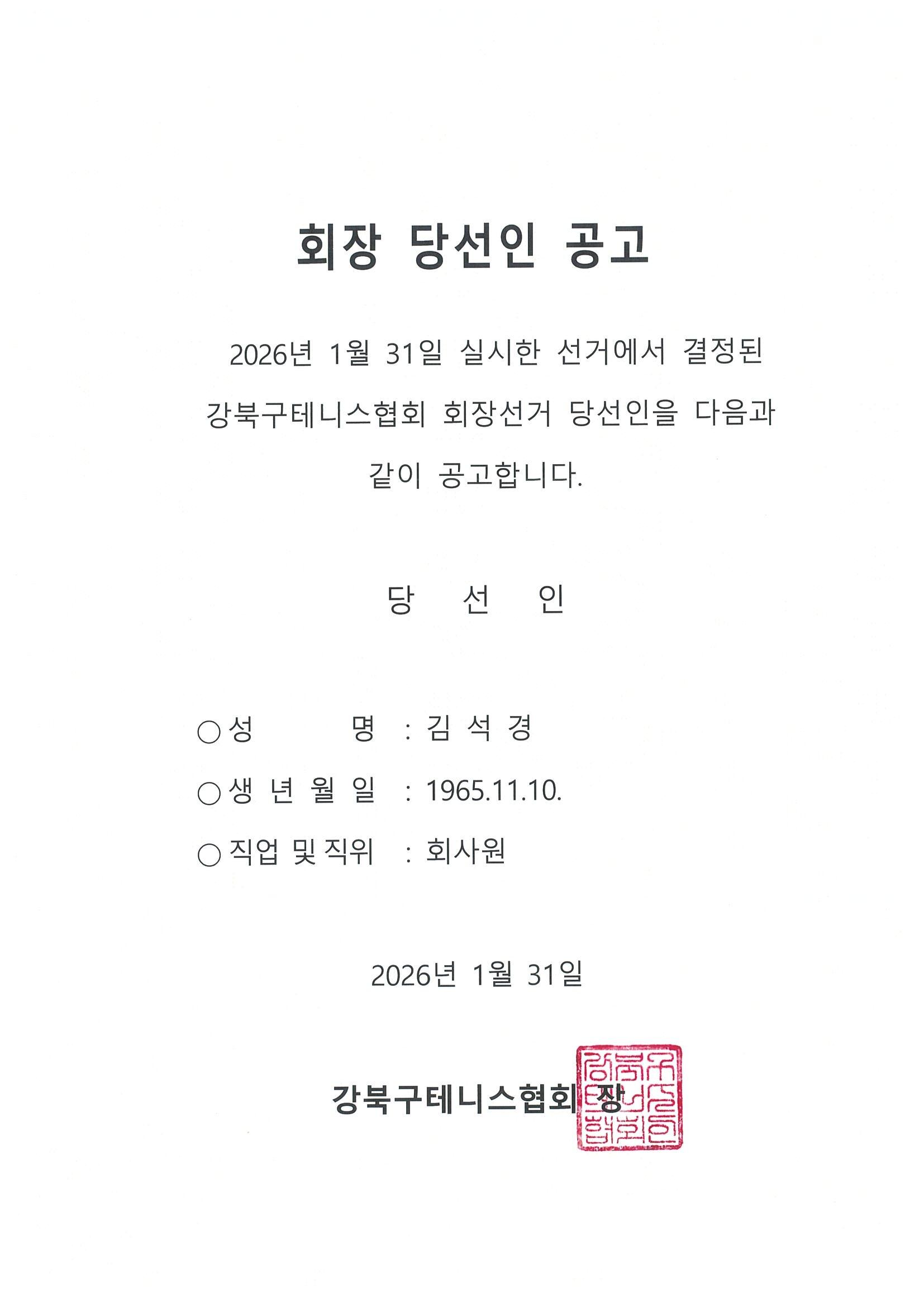 강북구테니스협회 회장 선거 당선인 공고